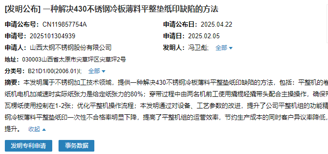 2025年4月22日,山西太鋼不銹鋼股份有限公司成功申請一項名為“一種解決430不銹鋼冷板薄料平整墊紙印缺陷的方法”專利,申請公布號為CN119857754A,申請日期為2025年2月5日。