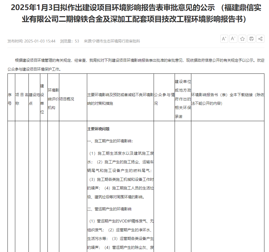 2025年1月3日,寧德市生態(tài)環(huán)境局就福建鼎信實(shí)業(yè)有限公司二期鎳鐵合金及深加工配套項(xiàng)目技改工程環(huán)境影響報(bào)告書作出審批意見并對(duì)外進(jìn)行公示,公示時(shí)間:2025年1月3日-2025年1月9日(5個(gè)工作日)。