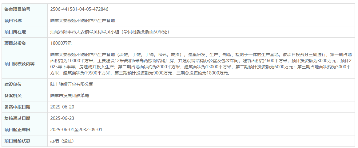 2025年6月23日,汕尾市陸豐大安駿婭不銹鋼飾品生產(chǎn)基地備案復(fù)核獲通過。